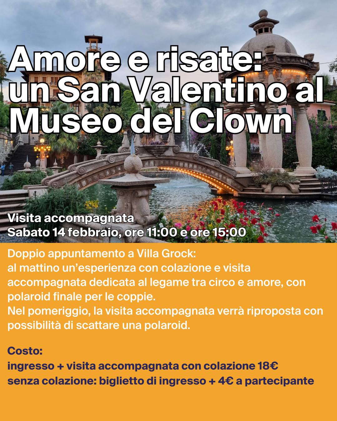 L’esperienza mattutina inizierà alle ore 11:00 con una colazione servita nello spazio esterno della villa, per accogliere i partecipanti in un’atmosfera tranquilla e suggestiva. A seguire, la visita accompagnata “Amore e risate: un San Valentino al Museo del Clown”, un percorso speciale che esplorerà il legame tra il circo e l’amore attraverso storie di clown innamorati e leggende romantiche. Al termine del percorso, le coppie potranno farsi scattare una polaroid in uno degli angoli più romantici della Villa, per portare con sé un piccolo ricordo della giornata.