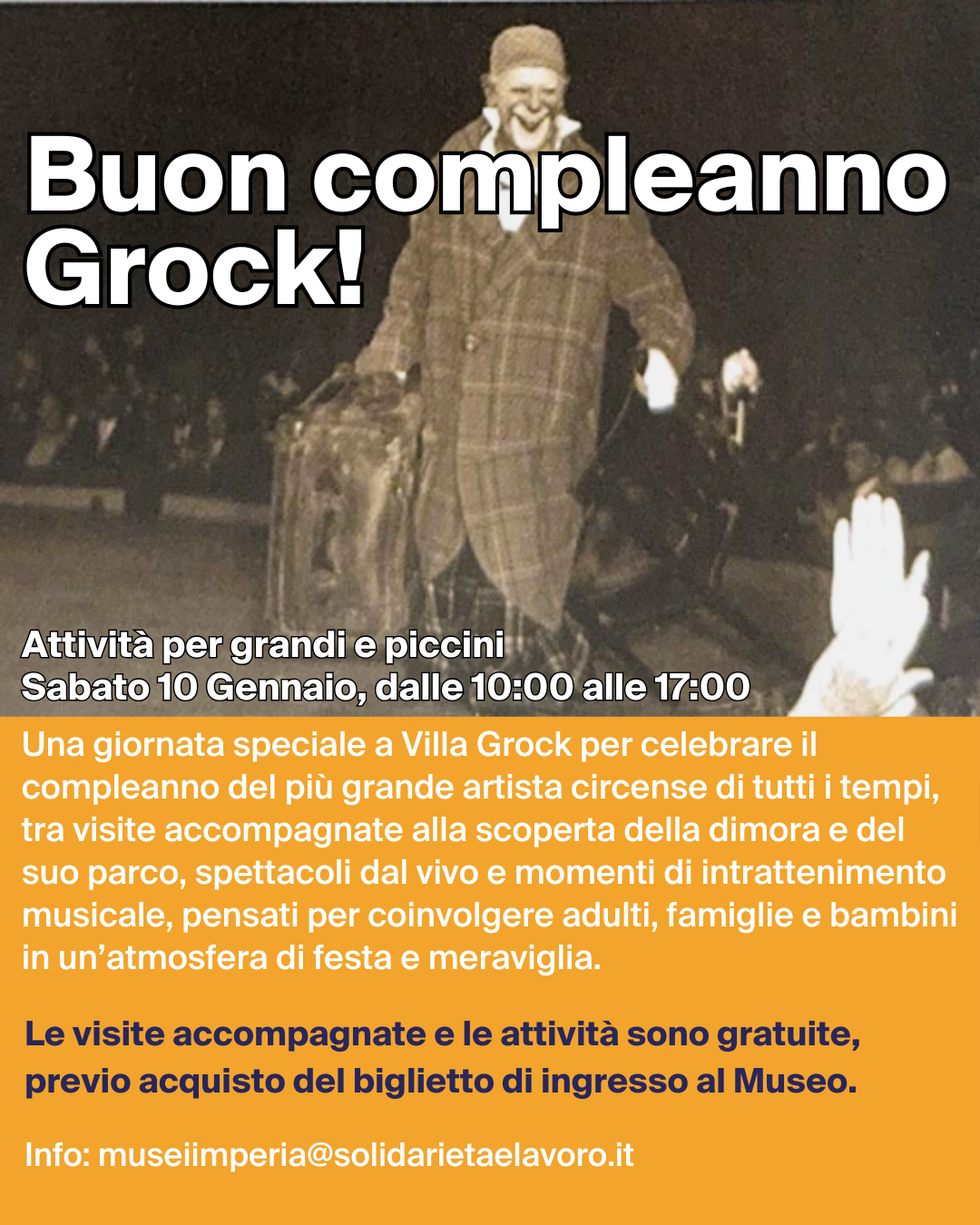 Sabato 10 gennaio Villa Grock, aperta starordinariamente con orario continuato dalle 10:00 alle 17:00, ospiterà una giornata di festa per celebrare il compleanno di Adrien Wettach, meglio conosciuto come Grock, considerato il più grande artista circense di tutti i tempi.