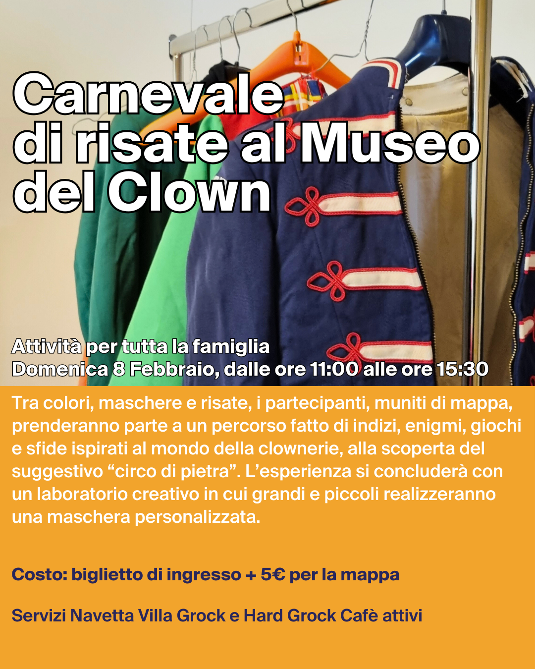 Domenica 8 febbraio, dalle ore 11:00 alle ore 15:30, Villa Grock, aperta straordinariamente dalle 10:00 alle 17:00, ospiterà un’attività per famiglie tra colori, maschere e risate: muniti di mappa, i partecipanti seguiranno un percorso fatto di indizi, enigmi, giochi e sfide ispirati al mondo della clownerie, alla scoperta del suggestivo “circo di pietra”. L’esperienza si concluderà con un laboratorio creativo in cui grandi e piccoli realizzeranno una maschera personalizzata.