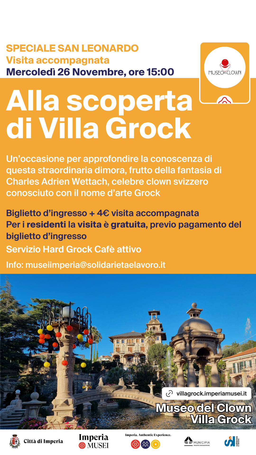 In occasione della Festa Patronale di San Leonardo, mercoledì 26 novembre, alle ore 15:00 la Villa ospiterà la visita accompagnata “Alla scoperta di Villa Grock”, un’occasione per approfondire la conoscenza di questa straordinaria dimora, frutto della fantasia di Charles Adrien Wettach, celebre clown svizzero noto con il nome d’arte Grock. L’itinerario permetterà di apprezzare la particolare architettura della Villa, un affascinante intreccio di elementi circensi, rococò, déco ed esotici, definita non a caso “Circo di Pietra”, circondata da un giardino, arricchito da tempietti, colonne, alberi esotici e suggestivi simboli massonici ed esoterici.