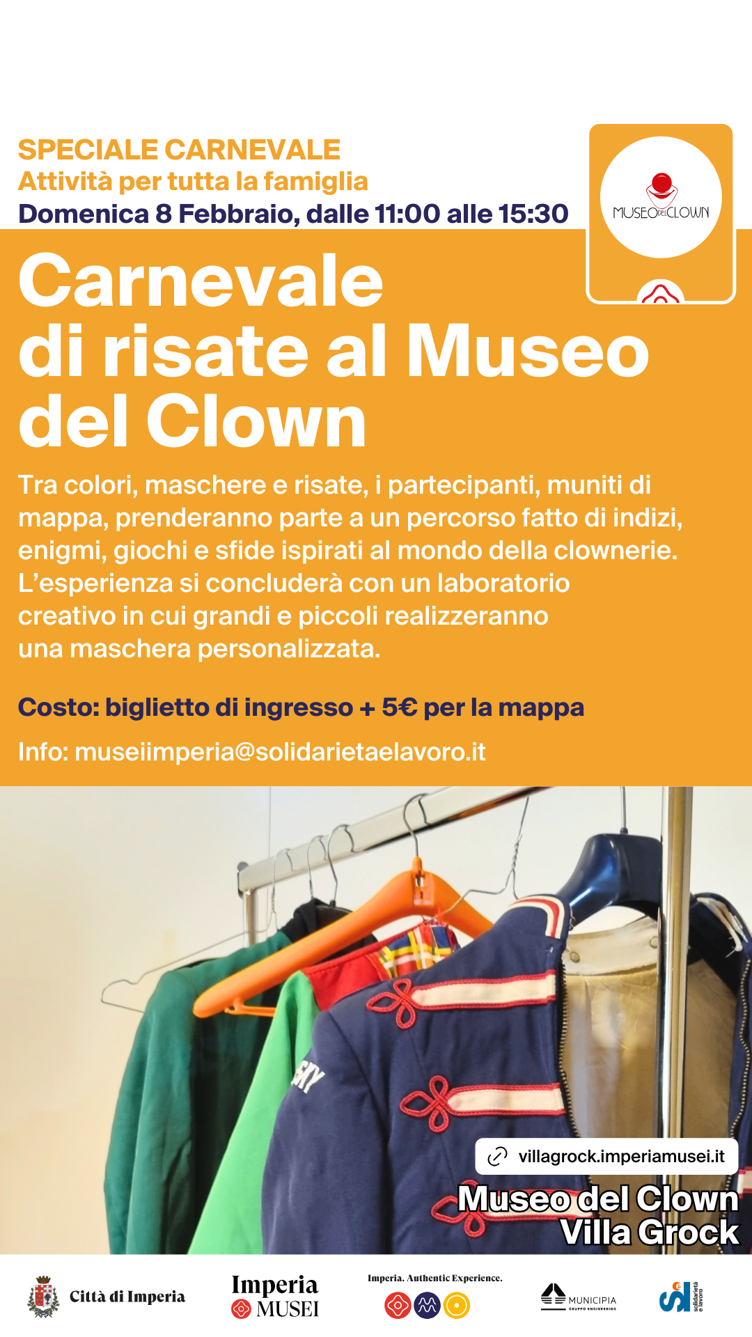 Domenica 8 febbraio, dalle ore 11:00 alle ore 15:30, Villa Grock, aperta straordinariamente dalle 10:00 alle 17:00, ospiterà un’attività per famiglie tra colori, maschere e risate, dove la tradizione carnevalesca incontra la giocosità della villa. Muniti di mappa, i partecipanti seguiranno un percorso tra indizi, enigmi, giochi e sfide ispirati al mondo della clownerie, alla scoperta del suggestivo “circo di pietra”. L’esperienza si concluderà con un laboratorio creativo in cui grandi e piccoli realizzeranno una maschera personalizzata.