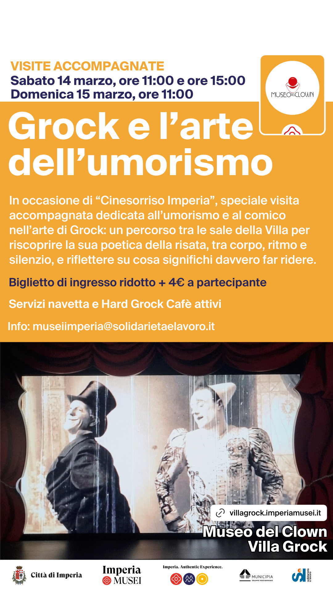 Sabato 14 marzo, alle ore 11:00 e alle ore 15:00 e Domenica 15 marzo, alle ore 11:00, in occasione di “Cinesorriso Imperia”, Villa Grock propone una speciale visita accompagnata dedicata ai temi dell’umorismo e del comico, intrecciati alla straordinaria pratica artistica di Grock.