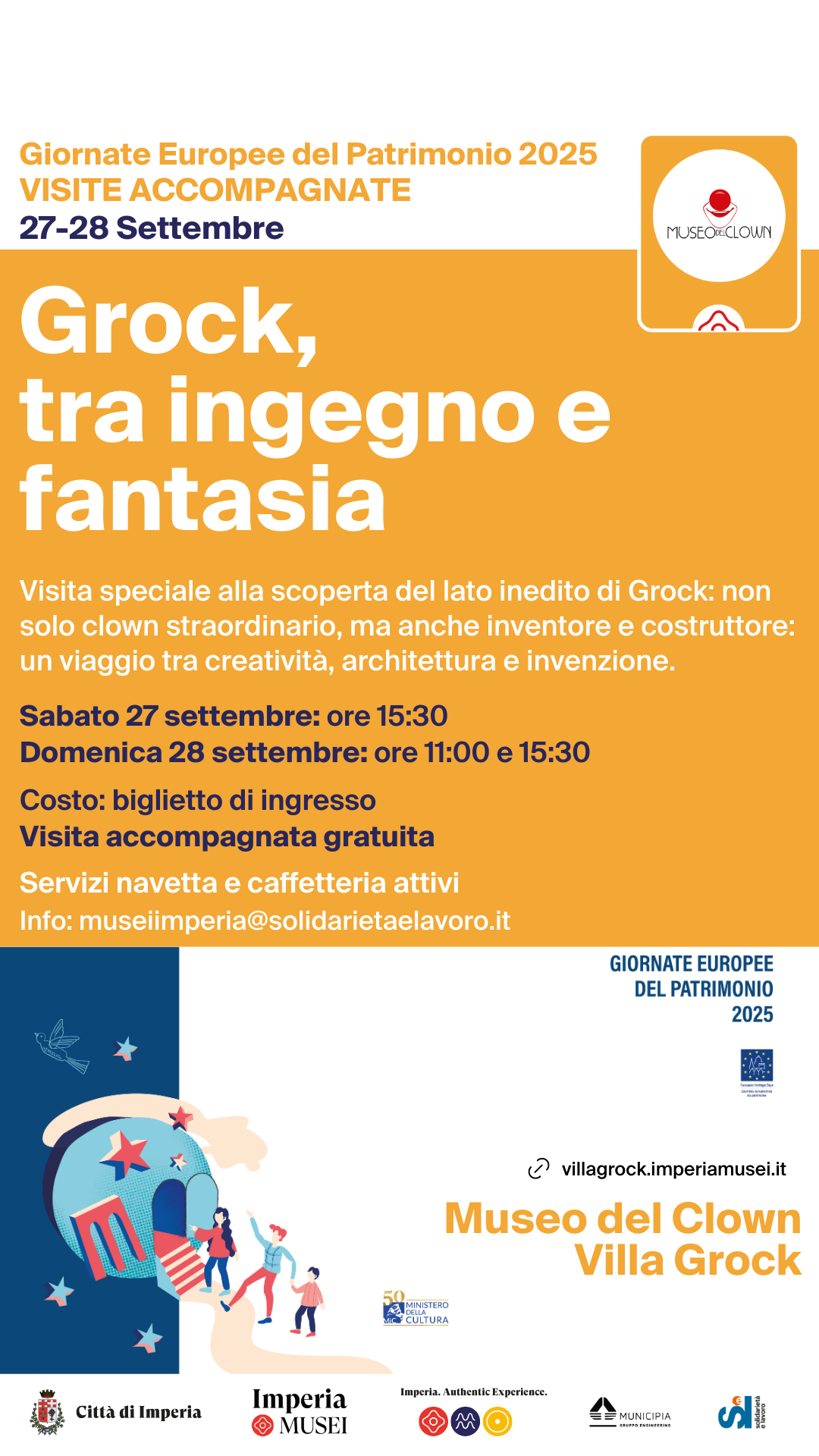 Sabato 27 settembre alle ore 15:30 e Domenica 28 settembre alle ore 11:00 e alle ore 15:30 Villa Grock apre le sue porte per una visita speciale dedicata al lato inedito di Grock: non solo clown straordinario, ma anche inventore e costruttore instancabile. Un percorso tra la villa da lui immaginata e decorata con fantasia, gli strumenti musicali che sapeva modificare e costruire, fino ai brevetti che raccontano il suo ingegno: un viaggio tra creatività, architettura e invenzione, per entrare nel suo universo poetico e visionario.