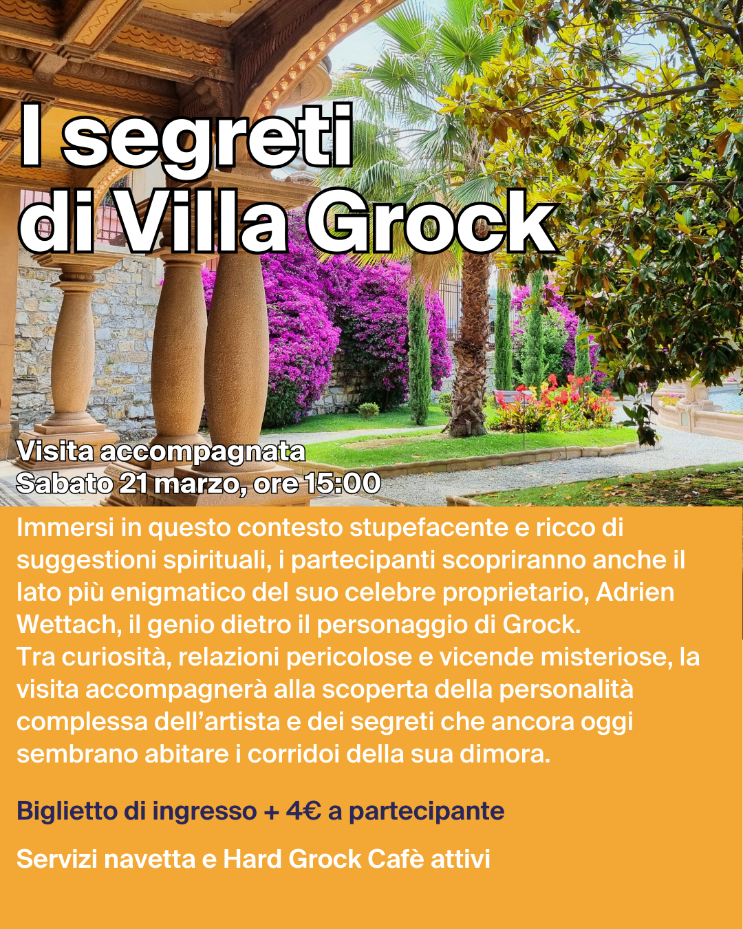 Sabato 21 Marzo alle ore 15:00, Villa Grock ospiterà "I segreti di Villa Grock" una speciale visita accompagnata alla scoperta dei lati più nascosti e affascinanti della Villa, tra simboli esoterici, leggende e suggestioni spirituali. Un percorso che svela anche il lato più enigmatico di Adrien Wettach, il celebre Grock, tra curiosità, vicende misteriose e i segreti che sembrano ancora abitare i corridoi della sua dimora.