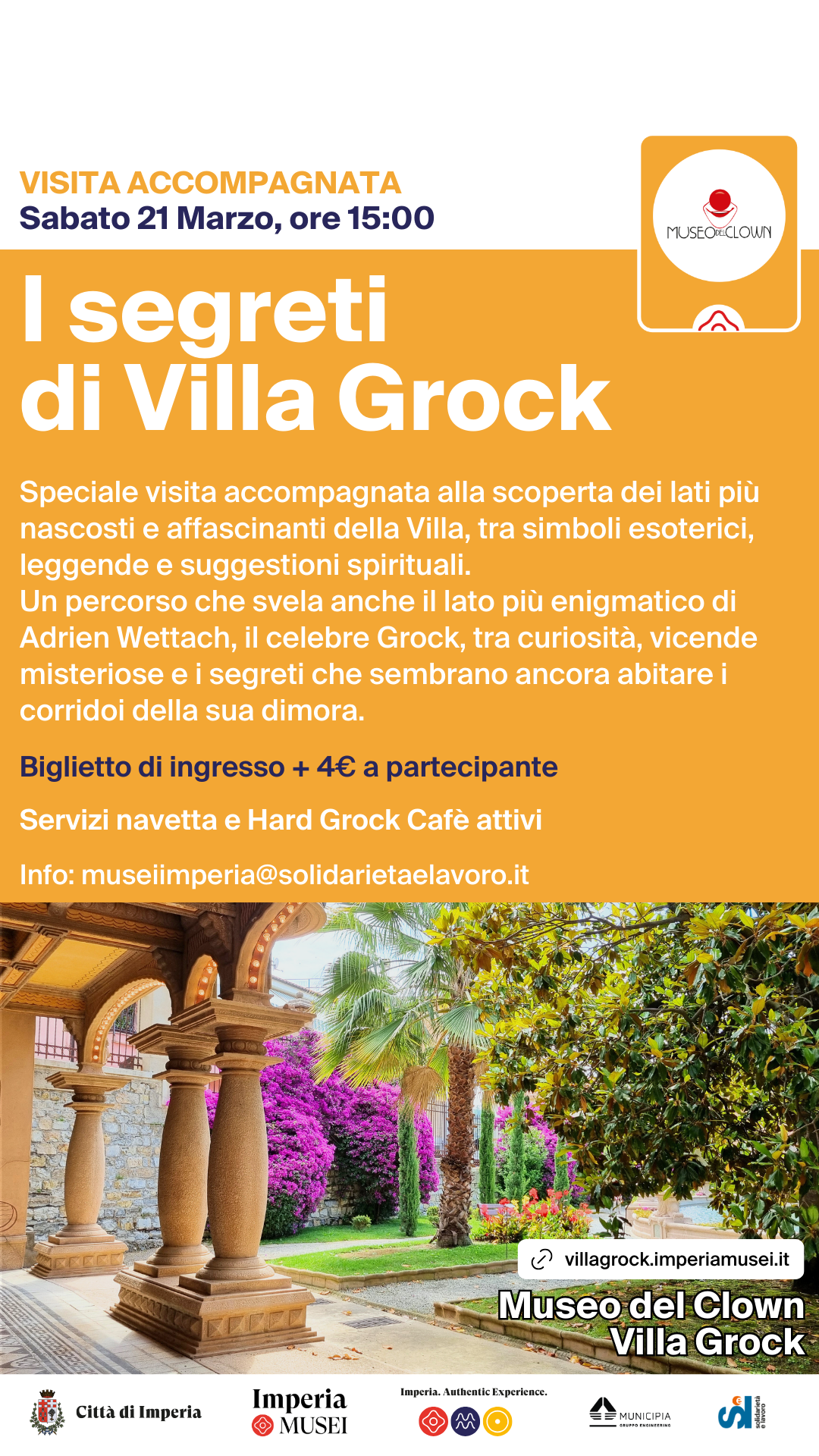Sabato 21 Marzo alle ore 15:00, Villa Grock ospiterà "I segreti di Villa Grock" una speciale visita accompagnata alla scoperta dei lati più nascosti e affascinanti della Villa, tra simboli esoterici, leggende e suggestioni spirituali. Immersi in questo contesto stupefacente e ricco di suggestioni spirituali, i partecipanti scopriranno anche il lato più enigmatico del suo celebre proprietario, Adrien Wettach, il genio dietro il personaggio di Grock.