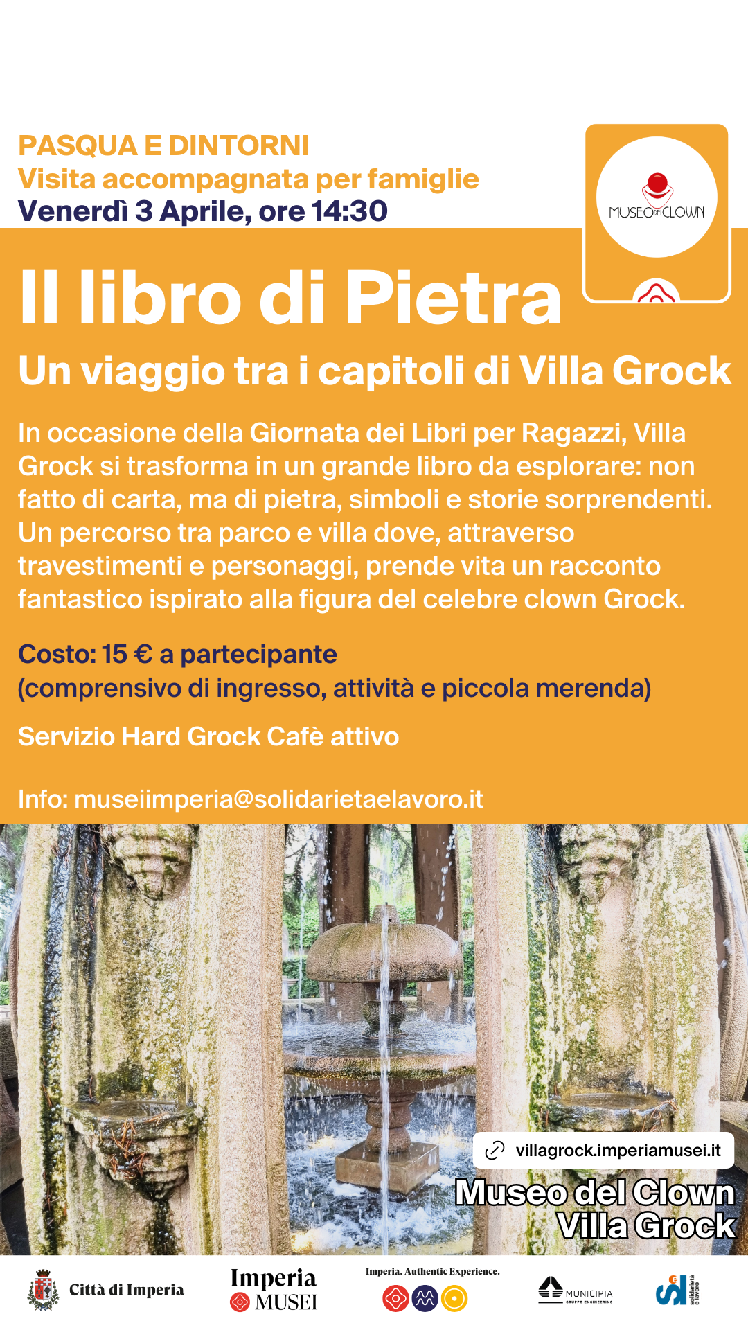 Si comincia Venerdì 3 Aprile alle ore 14:30 con “Il libro di Pietra: un viaggio tra i capitoli di Villa Grock”, una visita animata per famiglie in occasione della Giornata dei Libri per Ragazzi. Villa Grock diventa un grande libro da esplorare: non fatto di carta, ma di pietra, simboli, dettagli architettonici e storie sorprendenti. Durante il percorso nel parco e nella villa, i visitatori saranno accompagnati in un racconto fantastico ispirato alla vita e alla personalità del celebre clown Grock.