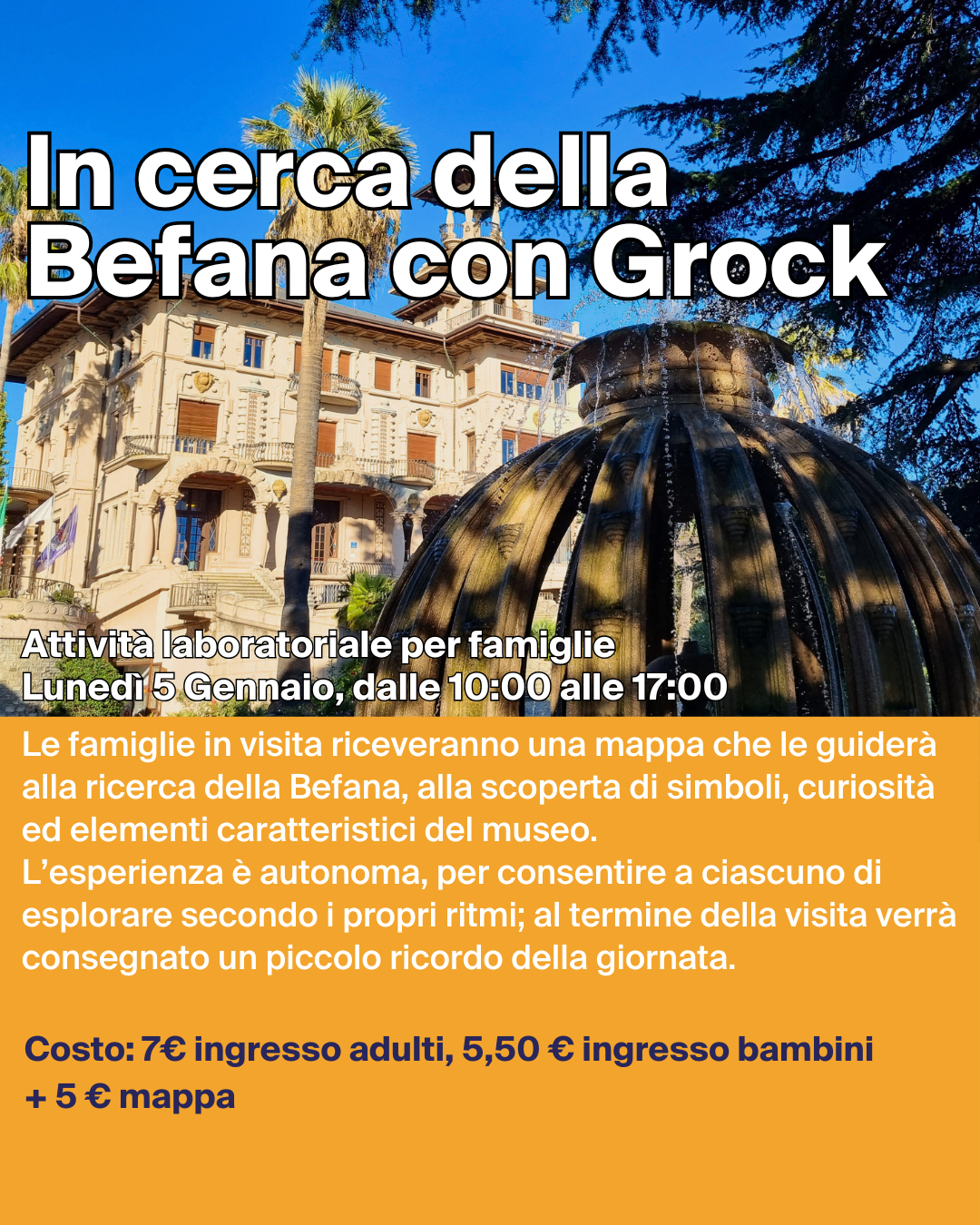 Lunedì 5 gennaio, dalle 10:00 alle 17:00, Villa Grock ospiterà "In cerca della Befana con Grock" una speciale visita libera dedicata alle famiglie.