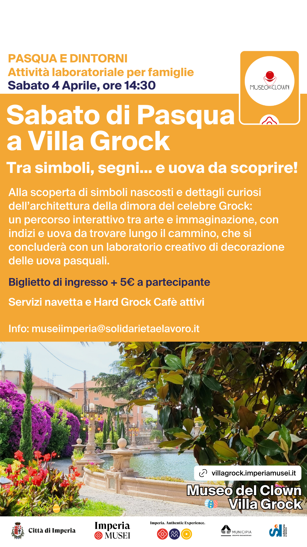 Sabato 4 Aprile alle ore 14:30 appuntamento con “Sabato di Pasqua a Villa Grock: tra simboli, segni… e uova da scoprire!”, una attività laboratoriale per famiglie tra il parco e la villa. Durante il percorso, i partecipanti saranno invitati a osservare con attenzione simboli e dettagli curiosi nascosti nell’architettura e negli spazi della dimora del celebre artista Grock.